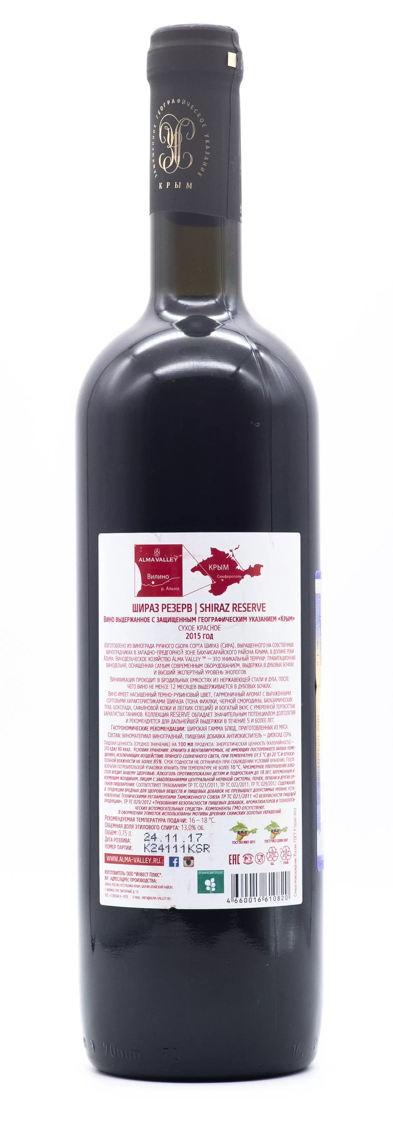 Вино имеет насыщенный темно-рубиновый цвет, гармоничный аромат с выраженными сортовыми характеристиками Шираза - тонами фиалки, черной смородины, бальзамических трав, шоколада, сафьяновой кожи и легких специй. Вино имеет богатый вкус с умеренной терпкостью бархатистых танинов.